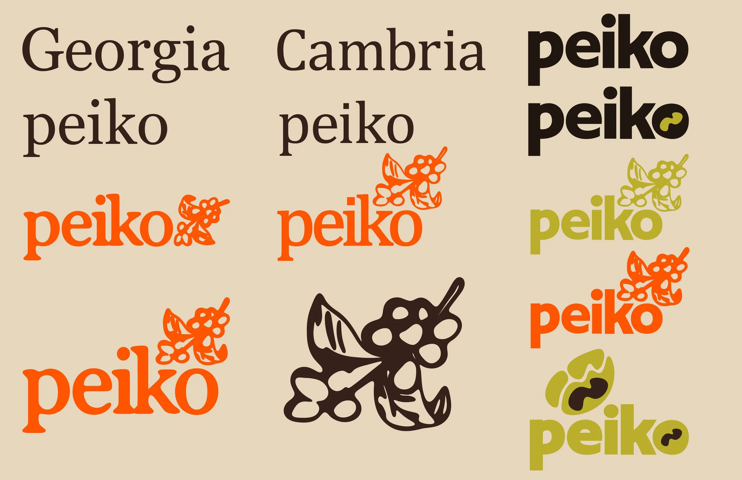 I chose a typeface with serifs because it felt more grounded and natural. I combined the letter “P” from Cambrias font with “EIKO” from Georgias font. I thought the Georgia font fit the look I was going for, but the “P” was too sharp. I tweaked the font to make the edges and corners more round, so that it could feel like it was worn by nature. I then added a logo that could be combined with the wordmark to make a logomark. The logo is of arabica coffee beans to show the origins of the brands beans. The colors are inviting and so I wanted the logomark and wordmark to match.